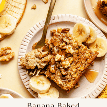 If you’re a banana bread for breakfast type of person then you’re going to love this cozy Banana Baked Oatmeal.ย A warm sliced of baked oatmeal always hits the spot for breakfast and this version is filled with old-fashioned oats, ripe bananas, chopped walnuts, and sweet maple syrup for just the right touch of sweetness. The best part? It is incredibly easy to make (even easier than banana bread) and a great option for you to meal prep and enjoy all week!