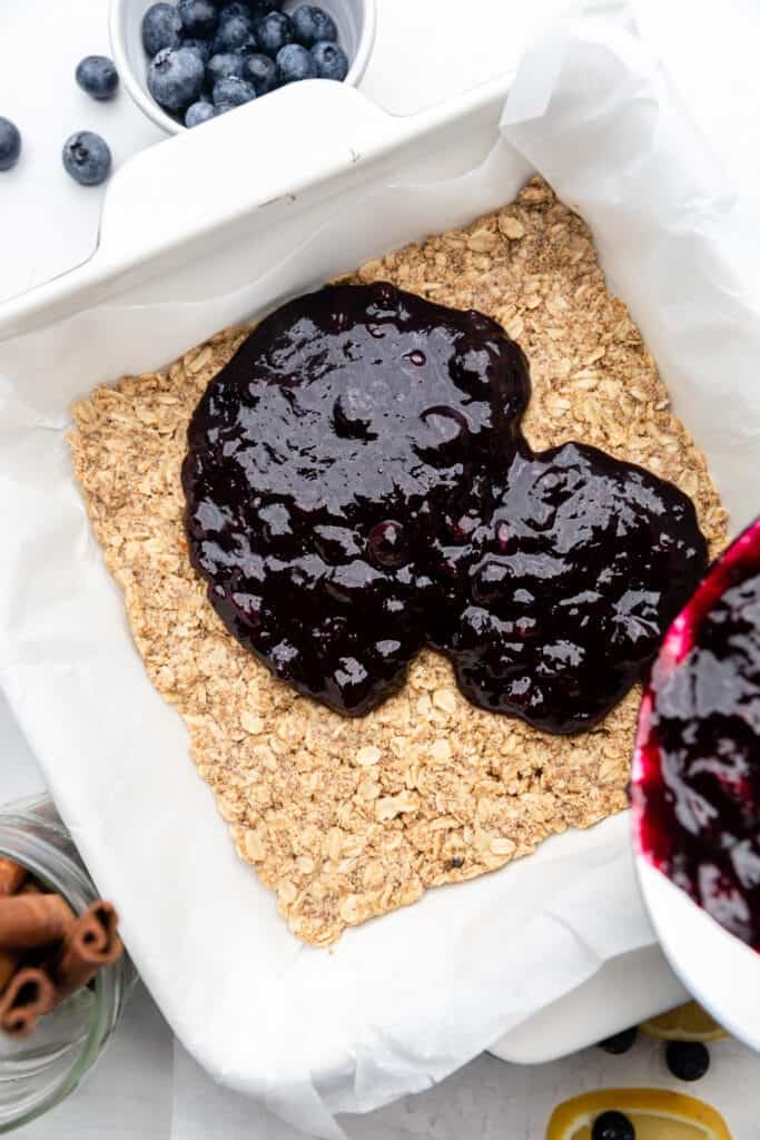 - Pour the blueberry jam on top of the crust and use a spatula to spread it evenly over the crust. Sprinkle the remaining crumb topping evenly over the jam.