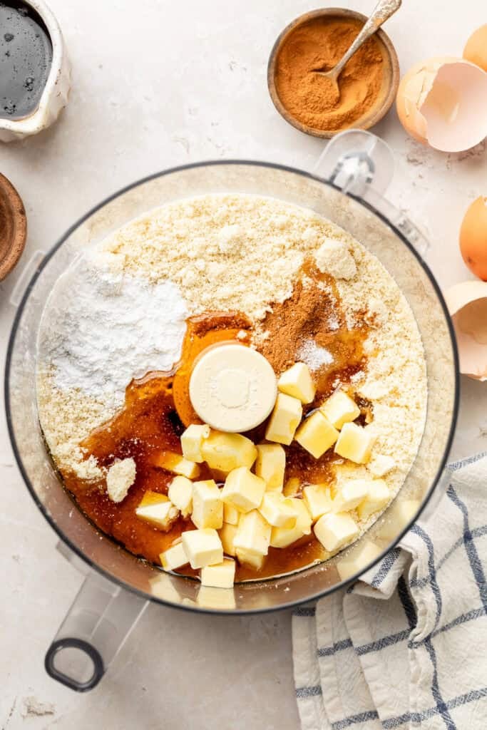 - Add the almond flour, tapioca starch, maple syrup, cold butter, vanilla extract, ground cinnamon, and sea salt to a food processor. Process the ingredients for around 30 seconds until a sticky ball of dough forms. You may have the scrape down the sides once to ensure that everything is well incorporated.