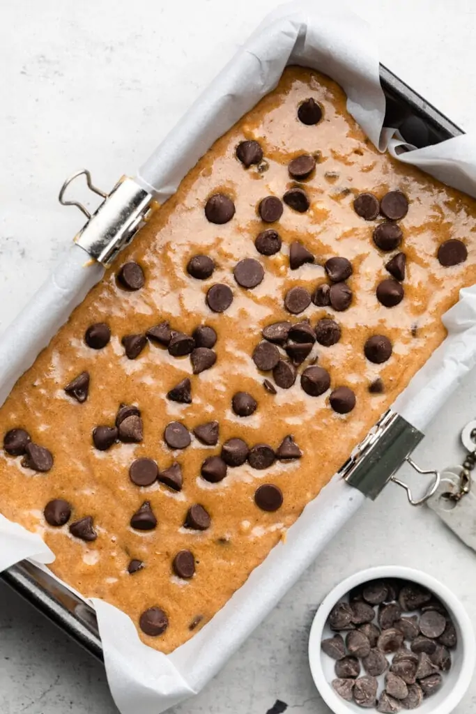- Transfer the batter to a prepared 9×5 loaf pan. Sprinkle extra chocolate chips on top.
