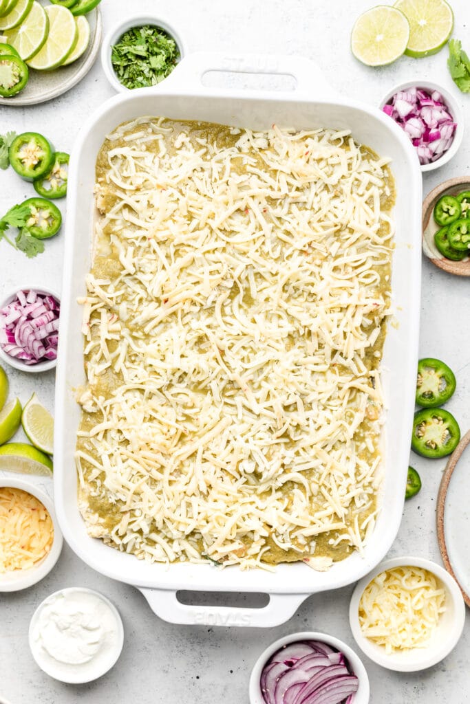 Green Enchilada Sauce: use your favorite jarred enchilada sauce to keep this recipe nice and easy.