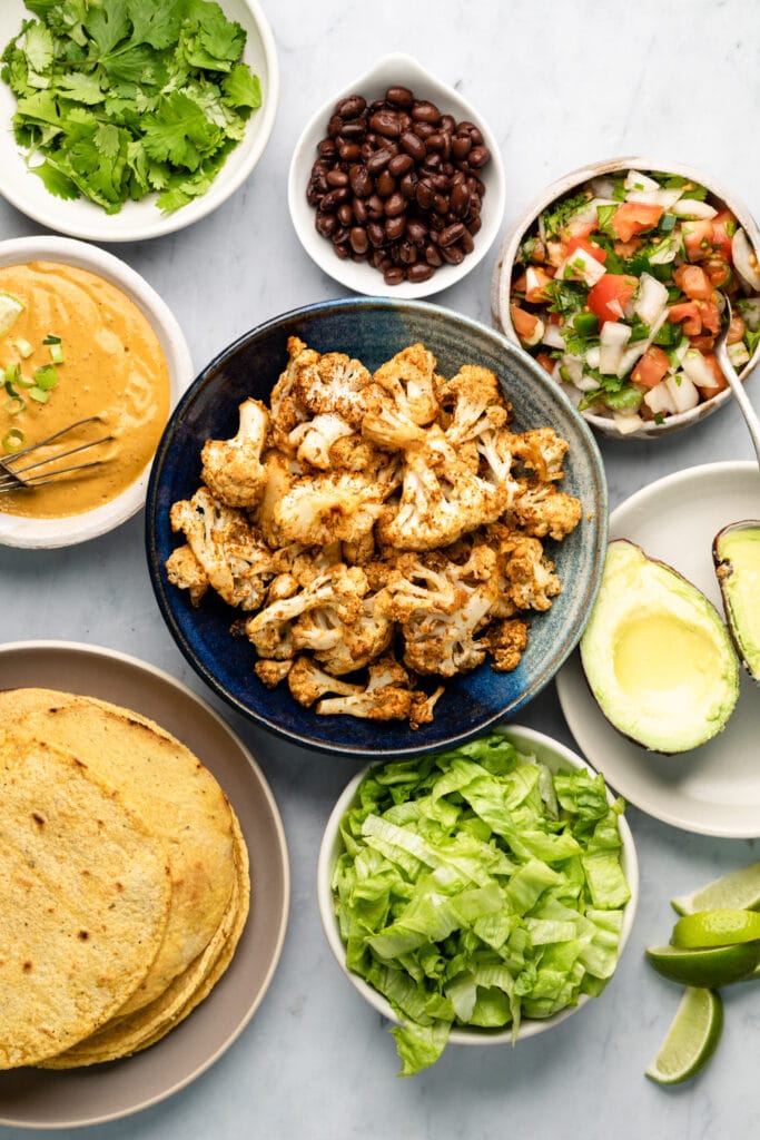 - Assemble your tacos by starting with warmed corn tortillas, shredded lettuce, black beans, cauliflower, spicy lime tahini, pico de gallo, and avocado. Serve immediately and enjoy!