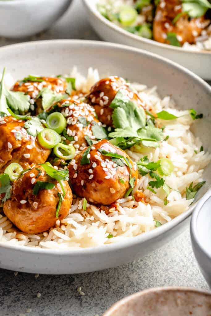 - Serve the meatballs and sauce over white rice and garnished with cilantro, green onion, and sesame seeds.